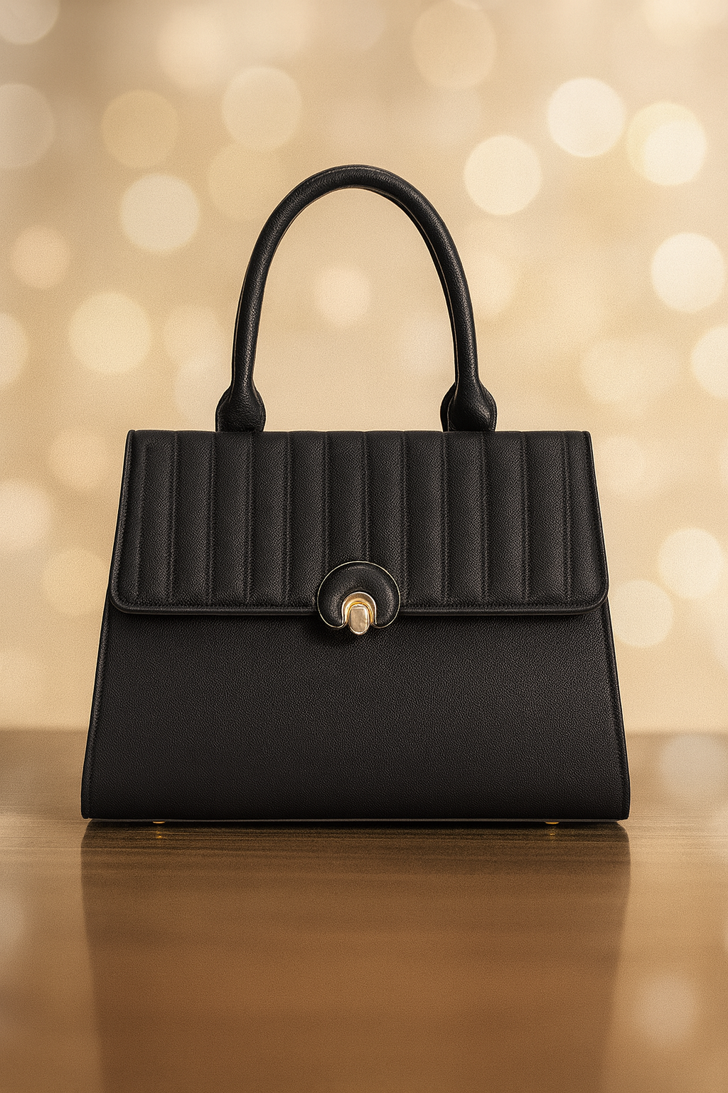 تتميز هذه الحقيبة بمقبض علوي ناعم وقفل دوار ذهبي اللون، مما يجمع بين الأناقة والإغلاق الآمن. يوفر تصميمها الداخلي الواسع مساحة كافية لجميع أغراضك اليومية، مع الحفاظ على مظهر أنيق وبسيط. بفضل لونها المتعدد الاستخدامات وتصميمها الكلاسيكي، تُعدّ هذه الحقيبة رفيقة مثالية للعمل، أو السهرات، أو المناسبات الخاصة.