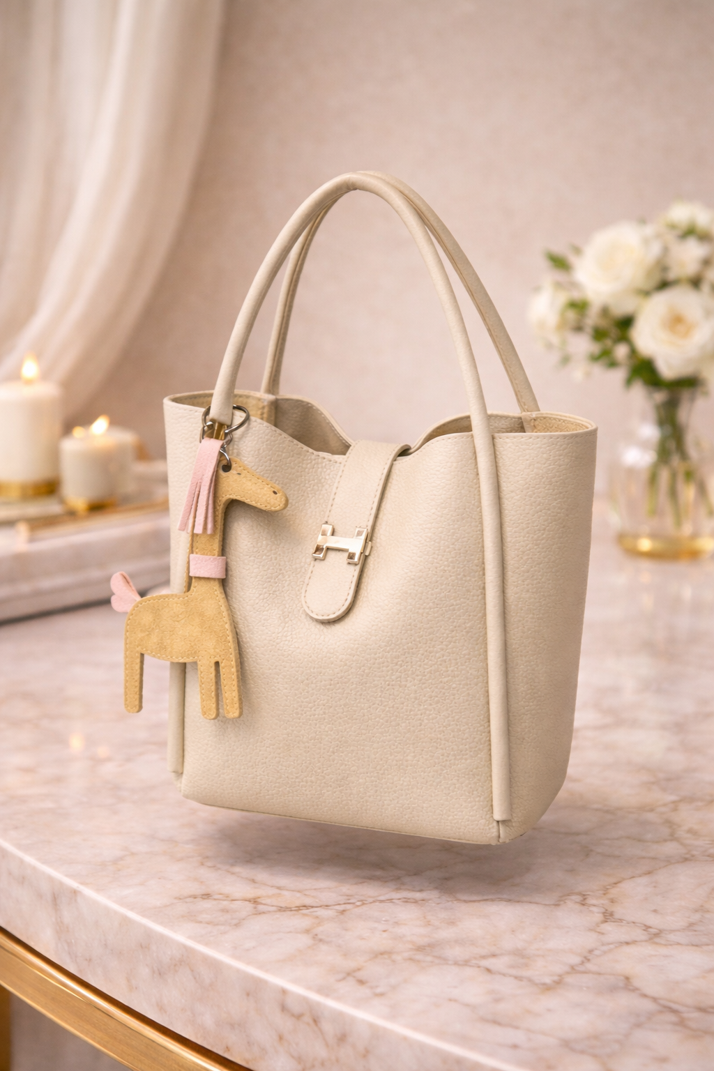 تتميز الحقيبة بإبزيم معدني أنيق ومقبضين علويين دائريين، مما يوفر الأناقة والراحة للاستخدام اليومي. يضفي تعليقة جلدية ساحرة على شكل حيوان لمسة مرحة وراقية في آن واحد، مما يجعل التصميم مميزًا ولا يُنسى.