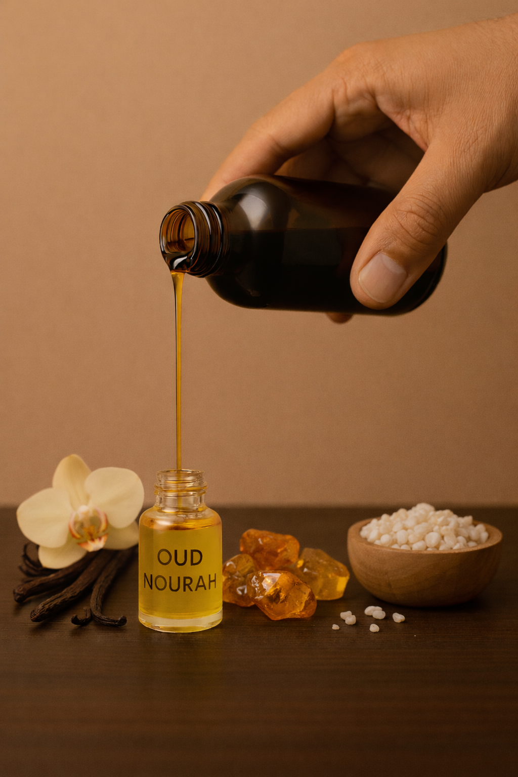عود نورة هو زيت عطري فاخر وآسر، يجسد الدفء والعمق والأناقة الخالدة. صُمم خصيصاً لمن يُقدّرون الفخامة الراقية، ويفتتح بنفحات الفانيليا الكريمية الحلوة، ليُضفي لمسة ناعمة ومريحة. في قلب العطر، تتفتح نفحات العنبر الناعمة، مانحةً دفئاً ذهبياً وثراءً راتنجياً يُعزز عمق الزيت وجاذبيته. أما قاعدته، فترتكز على المسك ، تاركةً أثراً نظيفاً وجذاباً يدوم طويلاً على البشرة.