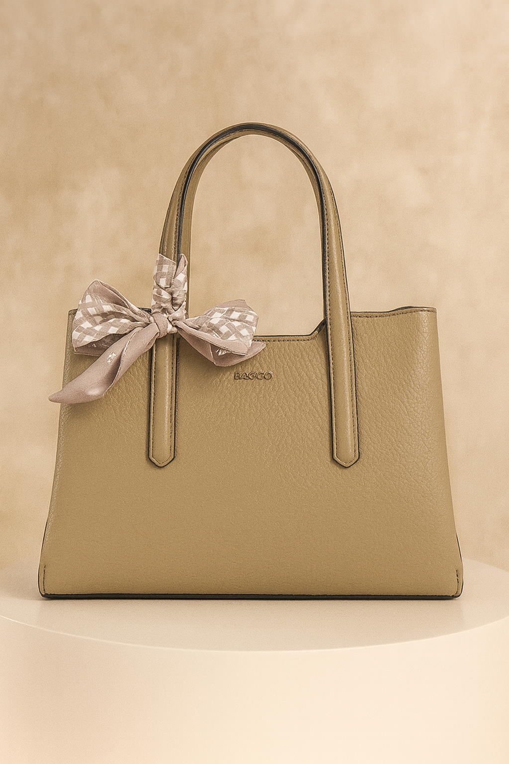 صُممت هذه الحقيبة بمقابض علوية طويلة ومريحة، مما يتيح حملها باليد أو على الكتف بكل سهولة. يضفي فيونكة حريرية رقيقة بنقوش مميزة، مربوطة بالمقبض، لمسة أنثوية ناعمة، تُكمل التصميم البسيط. أما لونها البيج المحايد فيجعلها متعددة الاستخدامات، حيث تتناسب بسلاسة مع الملابس الرسمية وغير الرسمية على حد سواء.