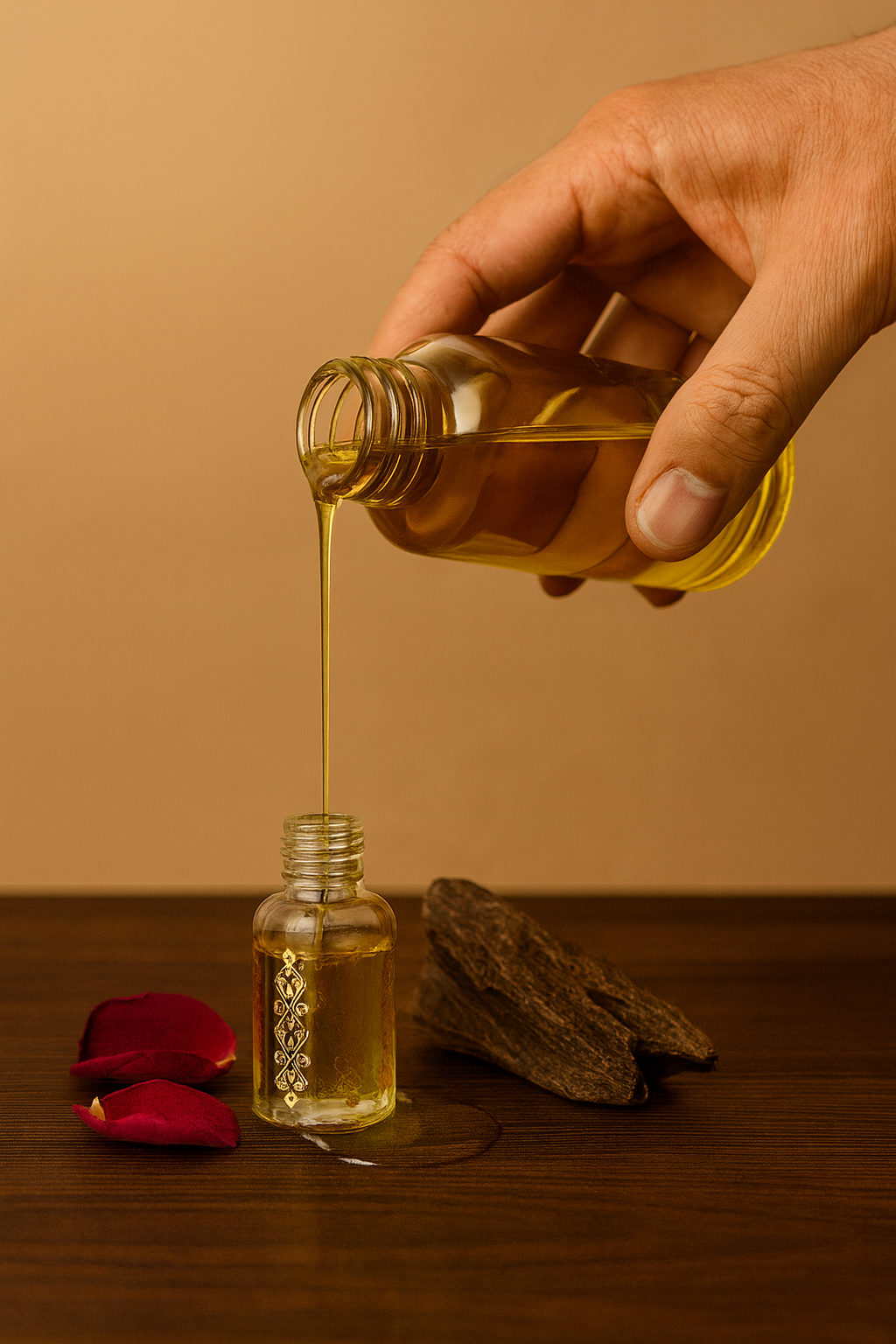 بمجرد أن يستقر على البشرة، يكشف العطر عن نفحات خشبية ناعمة، وتوابل لطيفة، ودفء راتنجي خفيف. يتميز زيت الورد والعود بأنه حسي وراقي في آن واحد، ويدوم لفترة طويلة، ويترك أثراً رقيقاً، مما يجعله مثالياً لمن يقدرون مزيجاً متناغماً من الأناقة الزهرية وفخامة العود الخالدة.