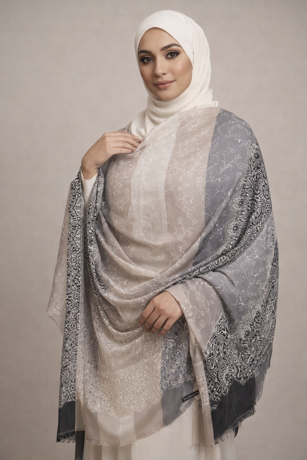 This elegant shawl features a soft, lightweight fabric adorned with intricate floral and paisley-inspired motifs. Designed in a refined palette of neutral tones—blending shades of beige, grey, and charcoal—the shawl offers a timeless and versatile look. The detailed border pattern frames the delicate all-over design, adding depth and sophistication. Finished with subtle fringed edges, it drapes beautifully and provides effortless comfort. Perfect for both everyday wear and special occasions, this shawl adds a graceful, polished touch to any outfit.